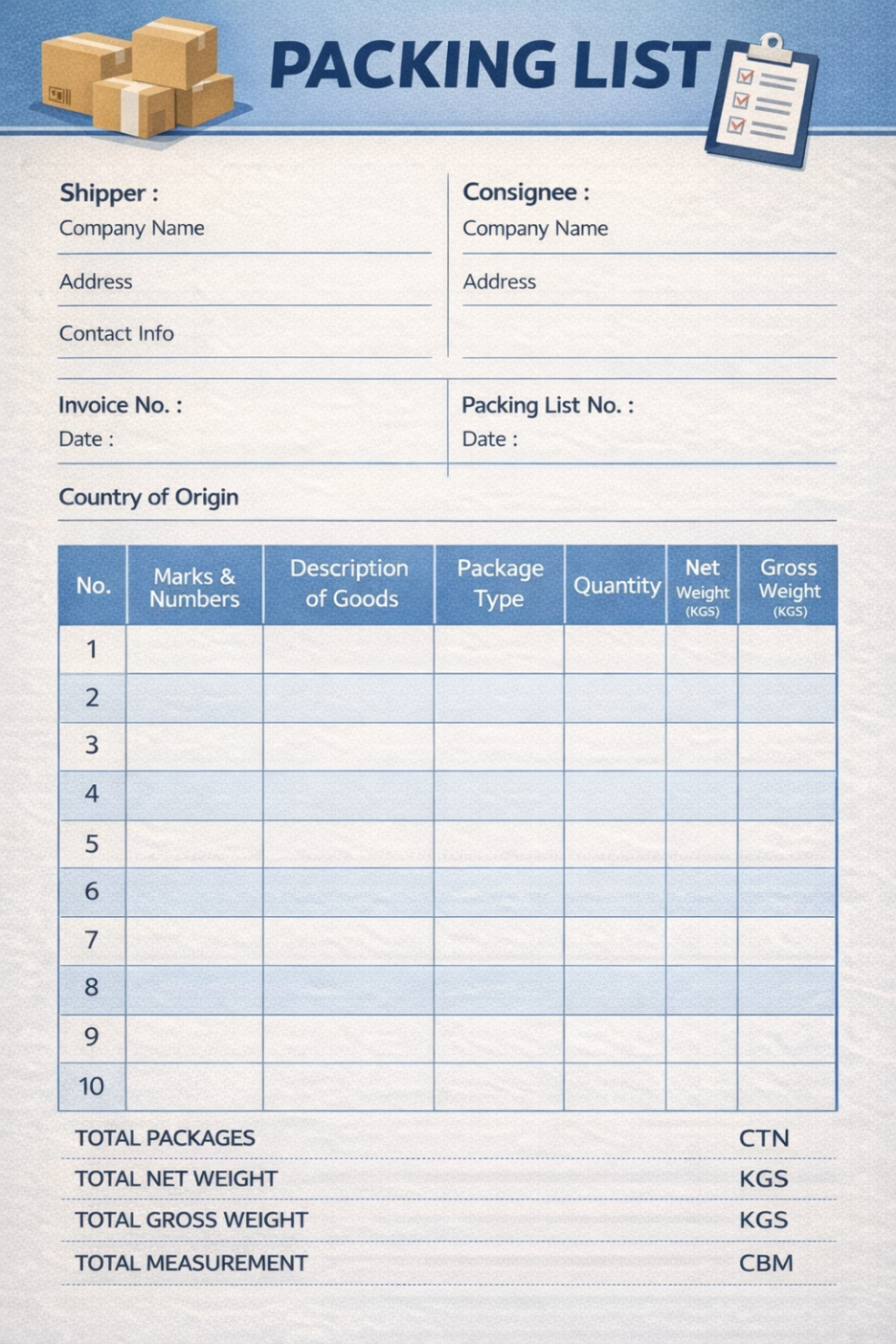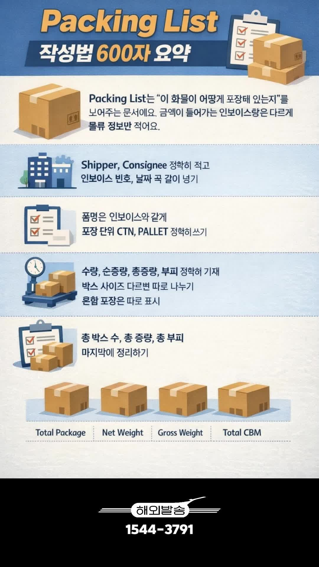Packing List(포장명세서)는 수출입 물류에서 화물의 실제 포장 상태를 설명하는 문서입니다. 세관, 운송사, 창고에서 화물을 확인할 때 매우 중요합니다.