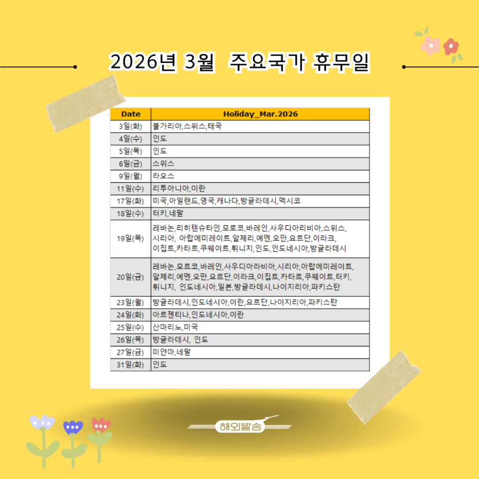 2026년 3월 주요 #국가별 #공휴일 일정을 아래와 같이 안내드립니다.